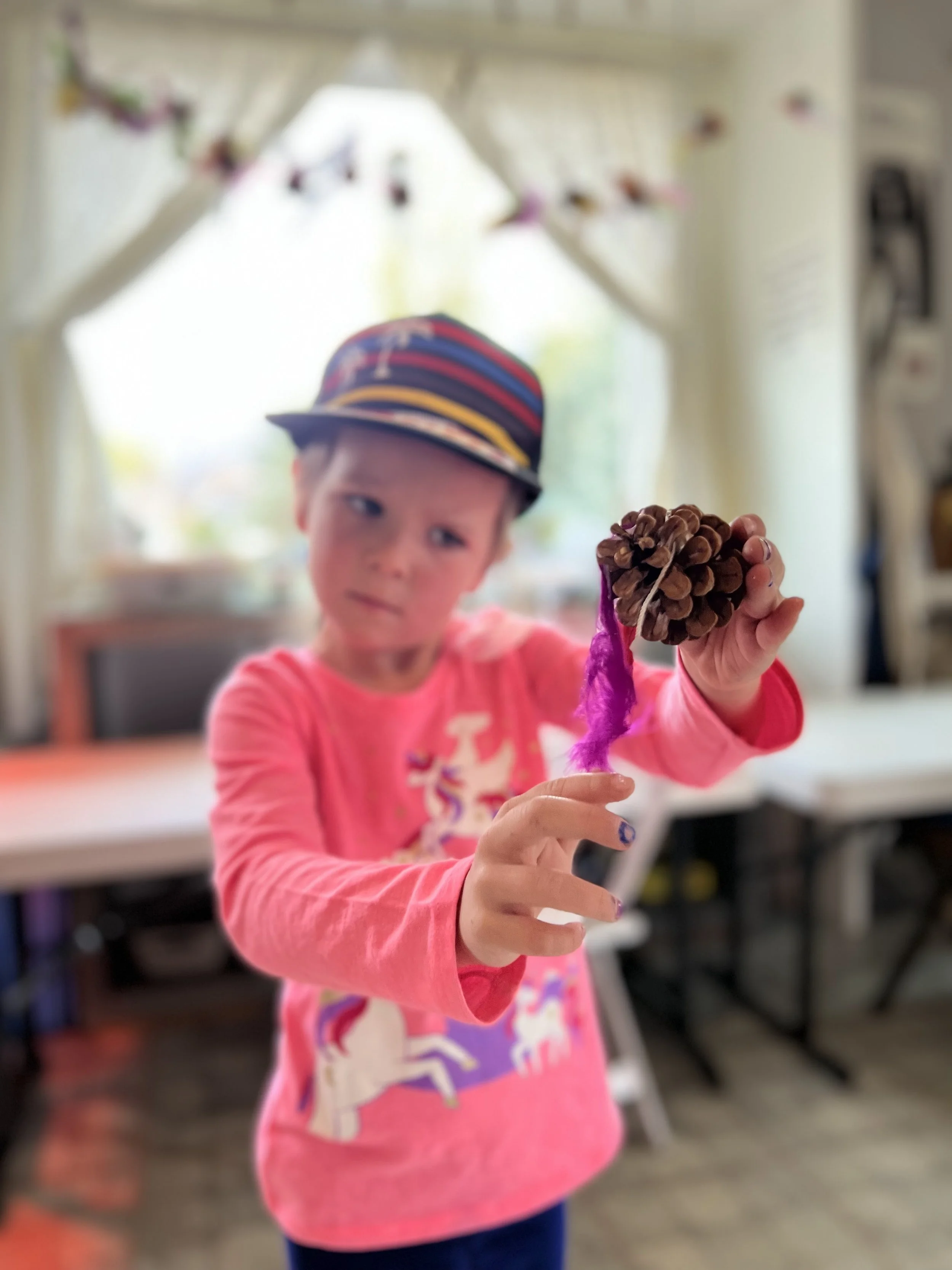Making a flying bird was a fun project where the children got to stand up and walk around. We hung pinecones from the ceiling and the children would pick out feathers to create their unique little bird. Teachers helped them glue on googly eyes and a beak to finish it off. Once the children completed their bird they got to lay on the ground and look up at it “flying around”. This activity required a lot of listening and steps. The children displayed maturity and responsibility following all the expectations to have a fun and orderly art project!